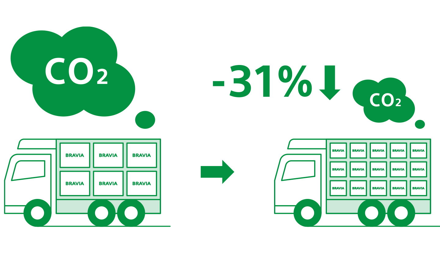 CO2排出量を極力抑えて大型テレビを輸送するために、製品を保護するパッケージのサイズや重さも見直しました。サイズを約41%、総重量を約12%削減。これにより、パレット1枚あたりに積載できる台数がアップし、製品1台あたりの輸送によるCO2排出量を約31%削減することに成功しました。