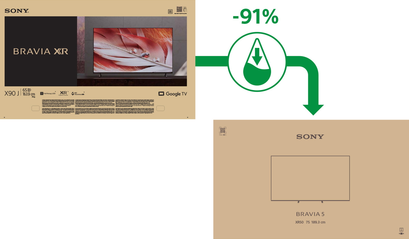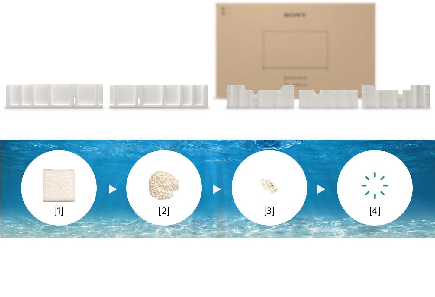 BRAVIA(ブラビア)は、業界で初めて大型テレビの梱包に採用している発泡スチロール製の緩衝材を撤廃。発泡スチロールに代わり、株式会社カネカ製の「カネカ生分解性バイオポリマーGreen Planet」を採用しました。この素材は「OK Biodegradable MARINE」認証を取得しており、バイオマス由来で様々な環境下で生分解性を有し、土壌中だけでなく海水中でも分解されCO2と水に戻ります。
