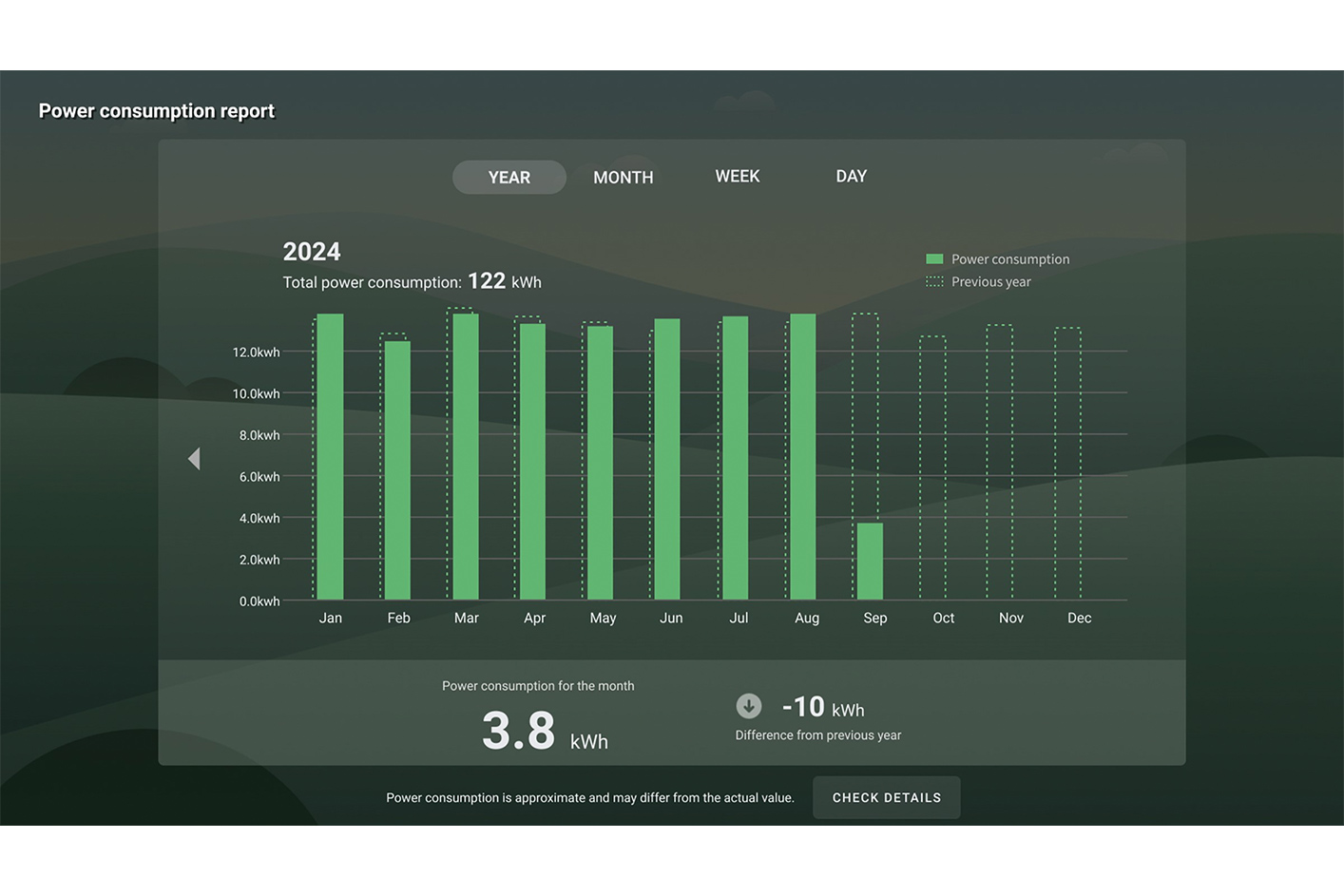 ECOメニューでブラビア®のさまざまな省エネ設定を簡単に一括設定することができます。テレビの視聴状況や部屋の環境等に応じた省エネ設定をすべて1か所で簡単にカスタマイズ可能。また、電力消費量を日ごと、週ごと、月ごと等で比較してチェックすることができるので、日々の環境負荷への貢献度も視覚的に実感できます。省エネを行うためのヒントも見ることができます。