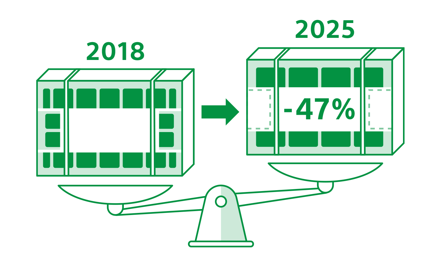 ブラビアの内部パーツに使用する再生鋼材の製造では、用途の同じバージン鋼材の場合と比較して、排出されるCO2の量を約63%削減しています。