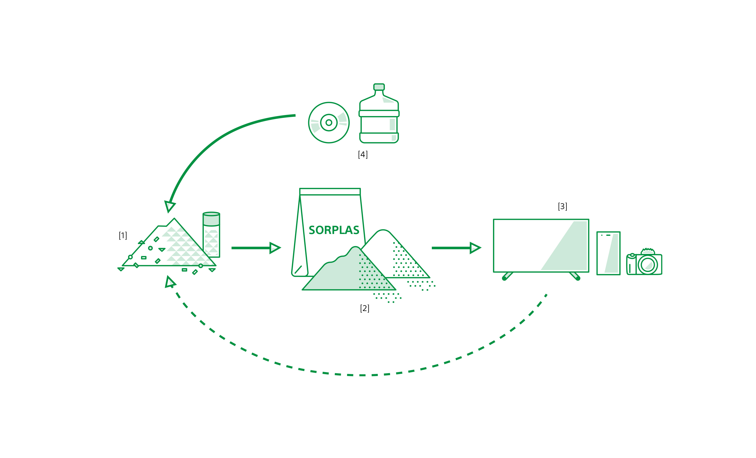 SORPLAS(ソープラス)は市場から回収された使用済みの水ボトルや、工場や市場から排出された廃ディスク、そしてソニーが独自開発した難燃剤などを原料に作られており、今やソニーの製品に限らず幅広い製品に採用されています。リサイクルを繰り返しても劣化しにくい特長を生かし、今後は回収されたSORPLASを製品の原料として再利用することも期待できます。