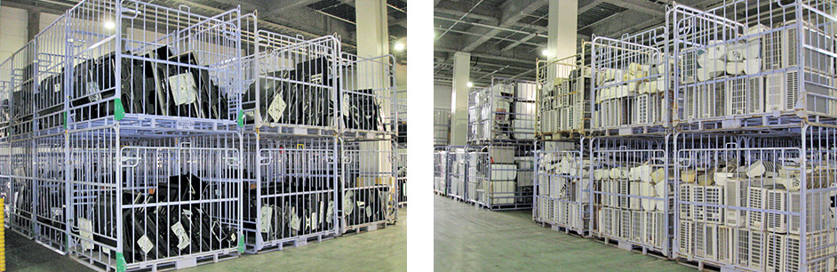 運ばれた製品は計量後、倉庫に積み上げて保管。コンテナ約150基を1日で処理します