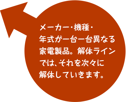 手作業で解体するため「一台ごとに異なる家電製品をいかに効率よく解体するか」が重要なポイントです。豊富な経験を持った作業者は、どんな家電製品でも素早く、正確に解体していきます。工場見学ではその熟練の早ワザに注目してください!