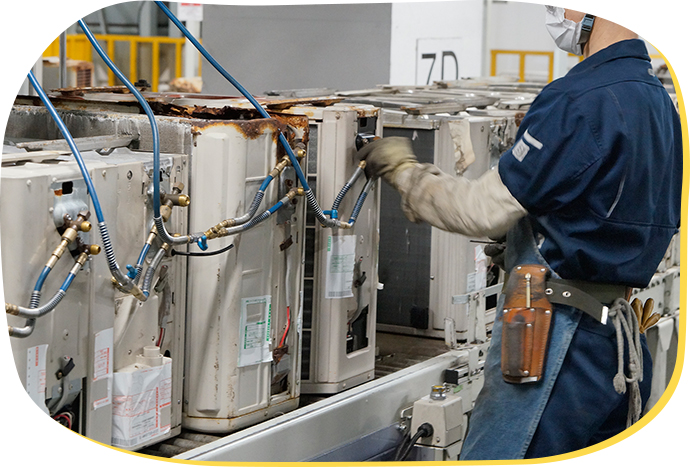 手解体のもう一つの目的が、化学物質の適正処理。家電製品に含まれる、フロン、鉛、水銀などの化学物質を、ていねいかつ確実に回収します。(左下の写真は、エアコン室外機のフロン回収の様子)