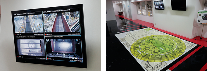 工場見学では大型破砕機の中をリアルタイムでモニターに表示。投入された大容量冷蔵庫などが数十秒で粉々になる様子は大迫力です!さらに見学フロアの床には破砕機の断面図が実物大でプリントされており、その大きさを体感できます!