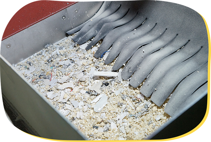 手解体で部品や化学物質を回収した後は、巨大なフードカッターのような大型の破砕機で、数センチ程度まで細かく砕きます。こうすることで、次の工程での機械による素材の選別がしやすくなります。