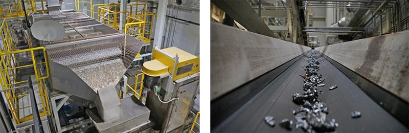 風力、磁力、渦電流、材質の比重差(写真左)を使って、素材ごとに選別します