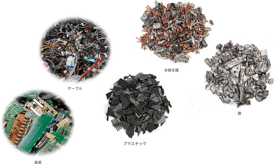 手解体によって回収された基板やケーブル等の部品に加え、機械で選別された鉄、非鉄金属(銅・アルミ)、プラスチック(ポリプロピレン、ポリスチレン・ABS樹脂)等の素材は新たな資源の素になります。