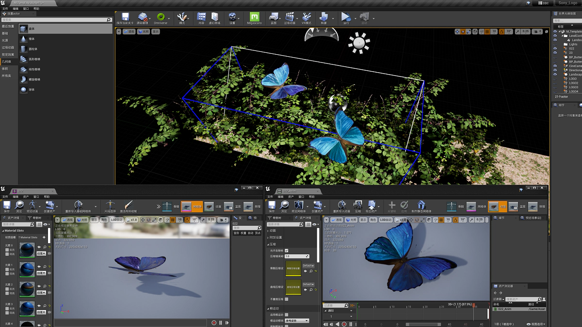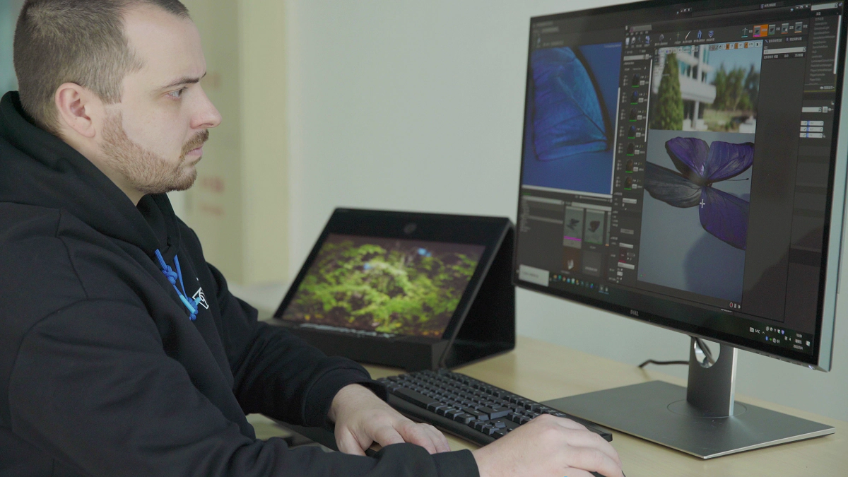 本次艺术创作以PBRMAX资产库中大蓝闪蝶的高精度数字资产为载体,以“花落草齐生,莺飞蝶双戏”为意向,创作了艺术化的动态场景。来自南美洲拥有梦幻蝶翼的精灵,与东方的诗词意象,首次在空间现实显示屏中产生了碰撞与融合。穿花蛱蝶深深见,观看者对蝶翼绚丽色彩的细腻感受,能体会到创作者对美好生活的向往。