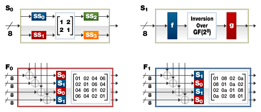 Two different kinds of non-linear functions called S-boxes are used in CLEFIA. See Figure 6. One is an 8-bit S-box which is based on 4-bit S-boxes, and the other is an 8-bit S-box which is based on an inversion in GF(28). By combining these two S-boxes with different algebraic characteristics, immunity against byte-oriented algebraic attacks is expected to be strong.