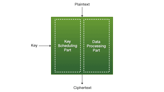 A blockcipher algorithm can be divided into two parts - a data processing part and a key scheduling part.