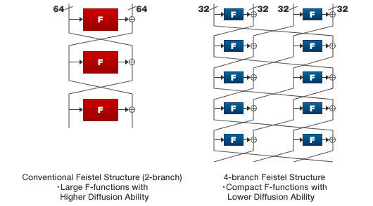 Due to this 4-branch structure, the size of each F-function is smaller than the 2-branch Feistel structure which requires double-sized input. This characteristic of the 4-branch structure enables us to implement these F-functions compactly both in hardware and software.