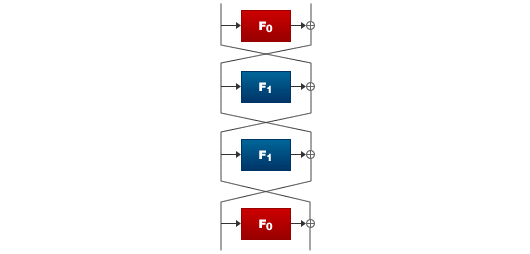 CLEFIA employs a generalized Feistel structure which contains 4-branch data lines. This structure is an extended version of the traditional 2-branch Feistel structure. There are two F-functions in a round. These F-functions are located in parallel in a round, and their input/output length is 32 bits long.