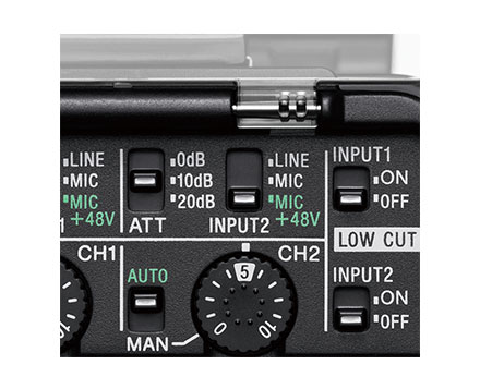 - Two input channels with independent record level, attenuator, MIC/LINE switching and wind noise reduction controls.