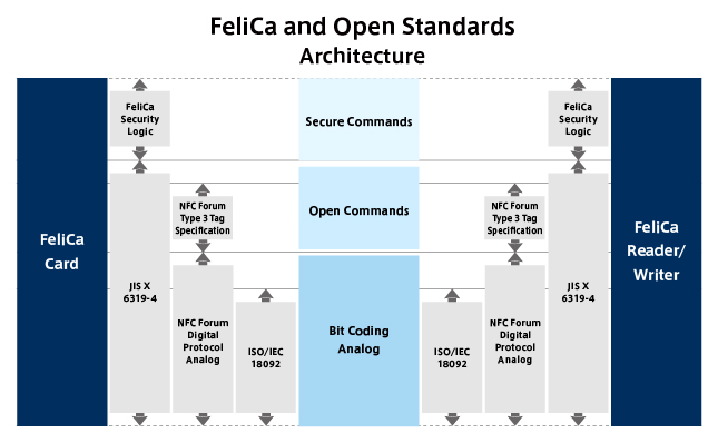 This figure shows the relationship between the different building blocks of the FeliCa technology and open standards.