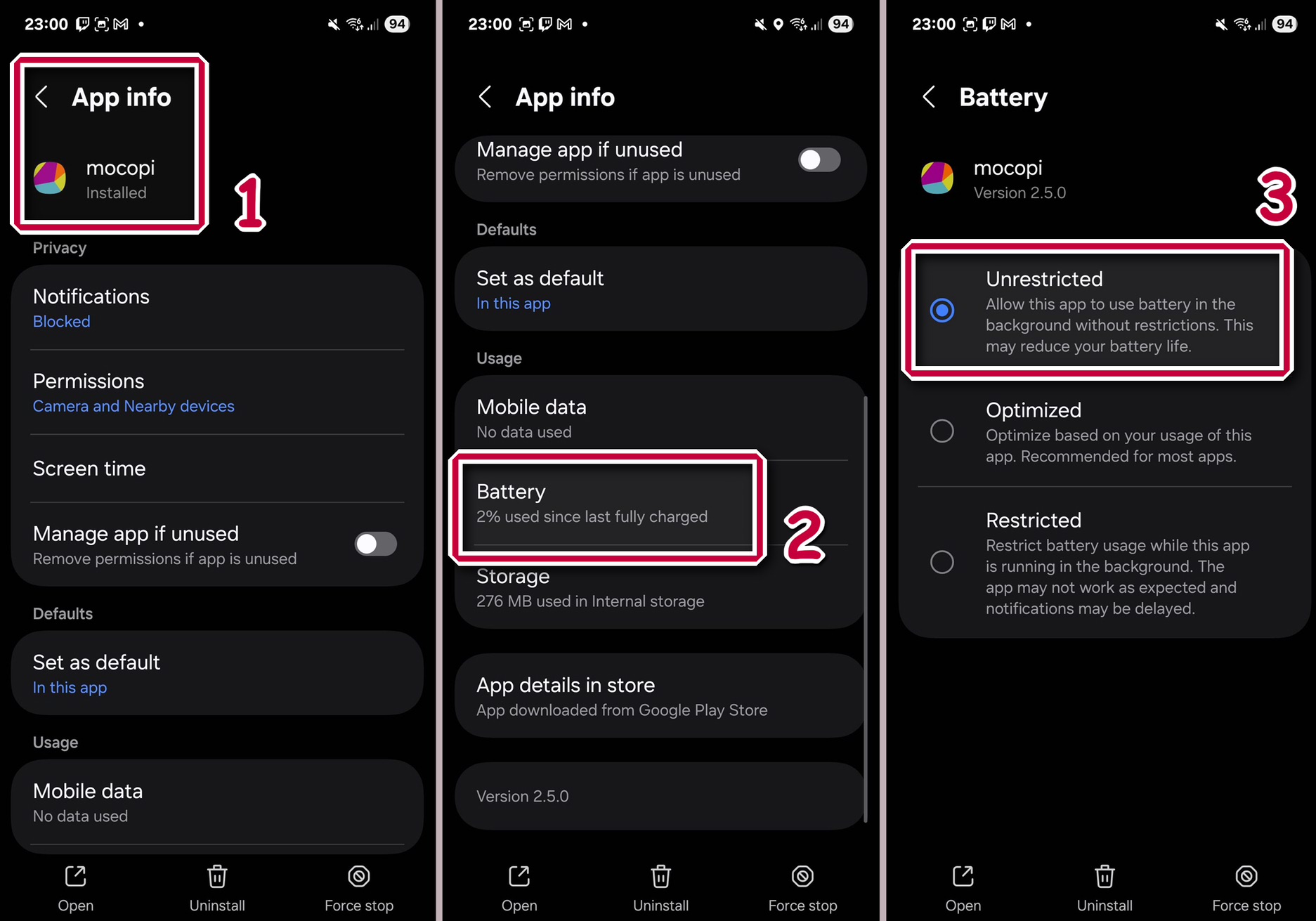 これを解決するには、Androidの設定でmocopiアプリのすべての省電力オプションをオフにし、バックグラウンドでのバッテリー使用が制限されないようにしてください。