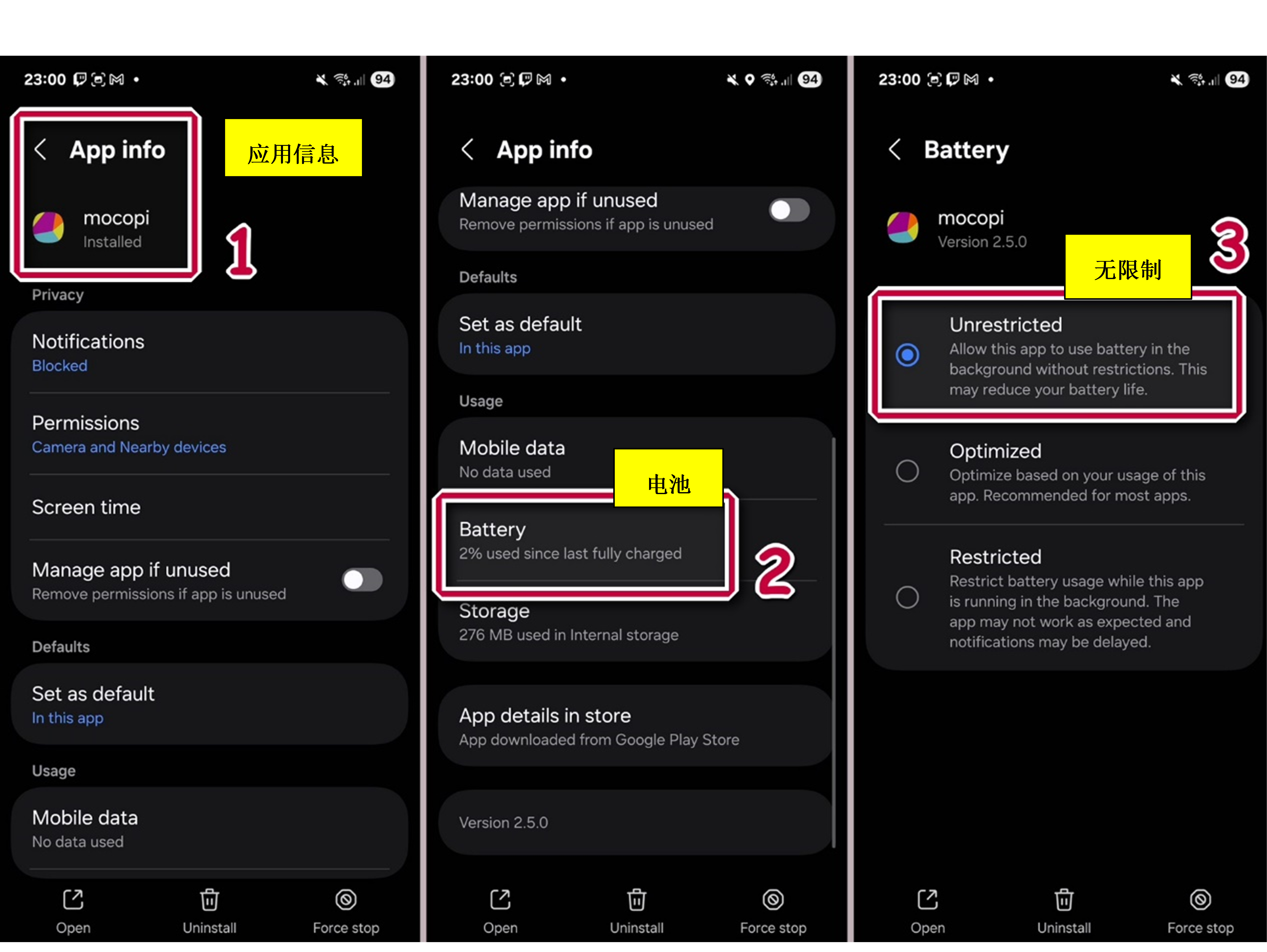 在 Android 系统中,根据设备不同,当应用未处于焦点状态时,系统会阻止其访问蓝牙或本地网络。此举旨在节省电量。这将导致在后台运行的 mocopi 应用与 mocopi 追踪器(蓝牙)或 VTube Studio(Wi-Fi)失去连接。要解决此问题,请确保在 Android 设置中关闭 mocopi 应用的所有省电选项,以允许其在后台无限制使用电池。