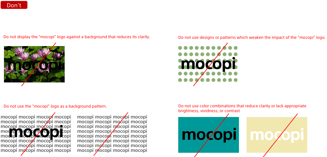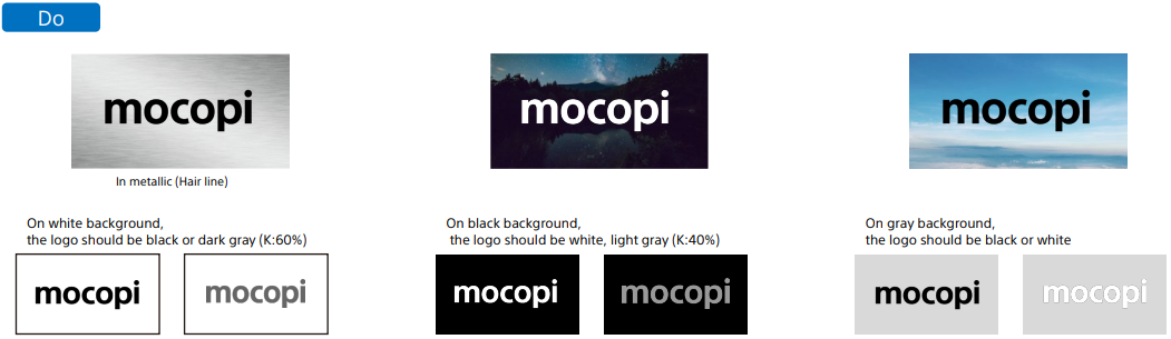 应谨慎选择“mocopi”标识和背景颜色的搭配。 应按照“4.1 正确的标识形式和复制方法”中的规定,以单色(白、黑、灰、银)显示“mocopi”标识。 虽未规定背景色,但应选择可明确区分“mocopi”标识的亮度、饱和度和对比度的颜色搭配,并以单色显示“mocopi”标识。