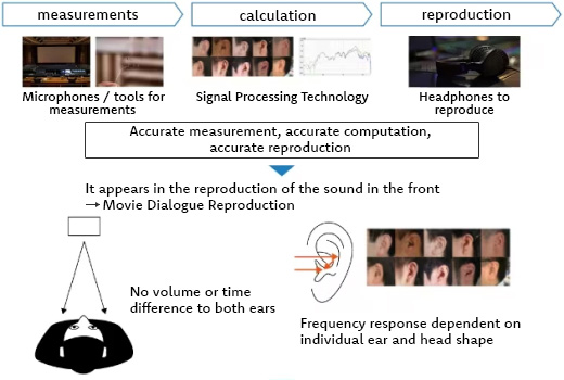 In achieving this accuracy, a signal processing technology called "binaural processing," which is used to reproduce a three-dimensional sound field, has been greatly advanced. Specifically, the different HRTF (Head-Related Transfer Function)* of each listener is measured individually and reflected in the generated audio signal, resulting in a dramatic improvement in accuracy.