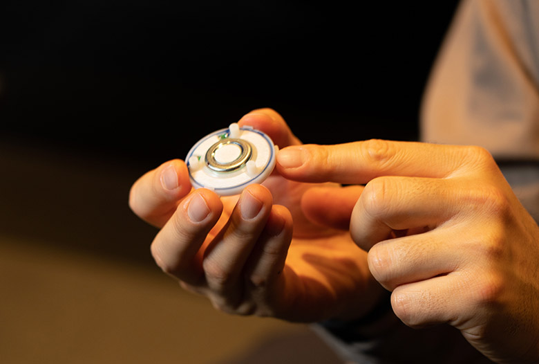 Shiomi:And here is the driver unit incorporating the diaphragm. The unique feature of this unit is the three tuned ducts on the back of the unit. These ducts are incorporated into the driver unit to provide beat response control, which is normally achieved through the use of ports on the housing of ordinary headphones. Another key point is that the ducts are evenly distributed in three locations along the circumferential direction of the diaphragm, which allows the piston motion of the diaphragm to be driven equally, resulting in low distortion sound quality.