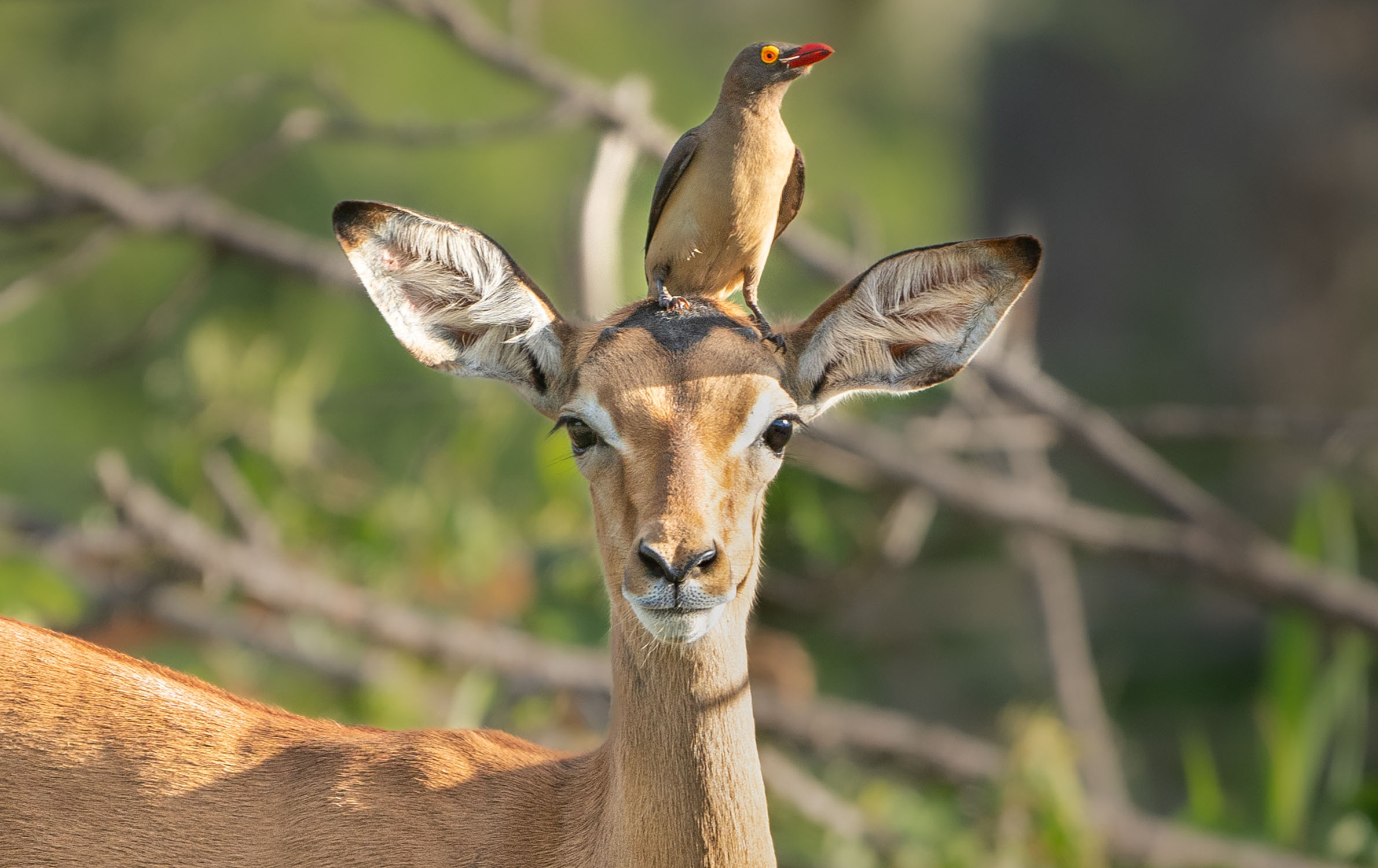 An oxpecker perched on the head of an impala, feeding on mites and fleas that live on impalas.