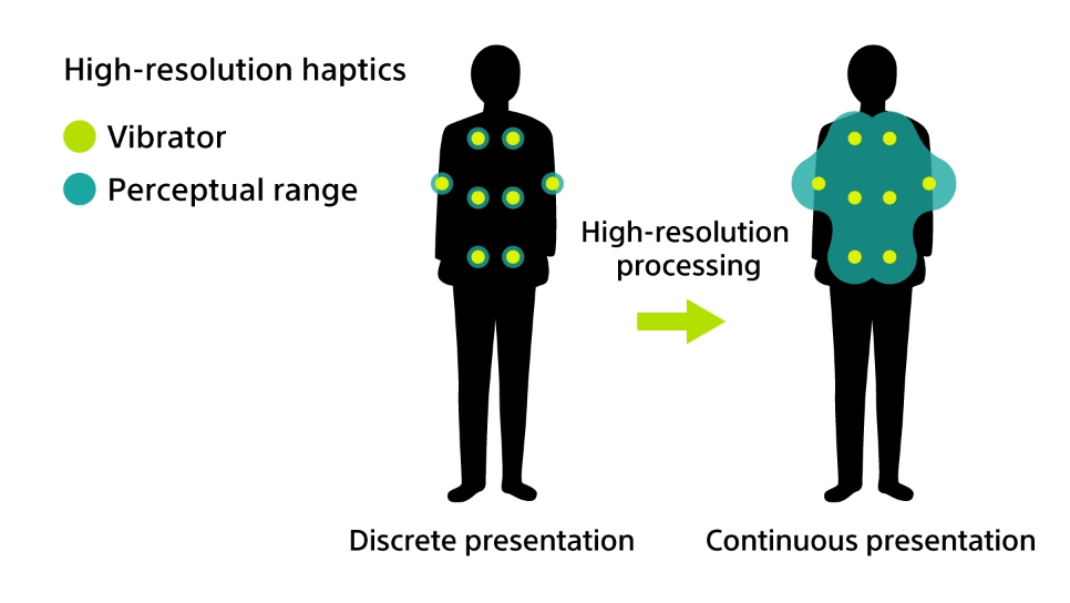 One of the enablers for the Haptic Vest is haptic super-resolution technology. Even when the number of vibrotactile devices is few, this technology can give the user the illusion that the position of vibration moves continuously, enabling natural sensory presentation.