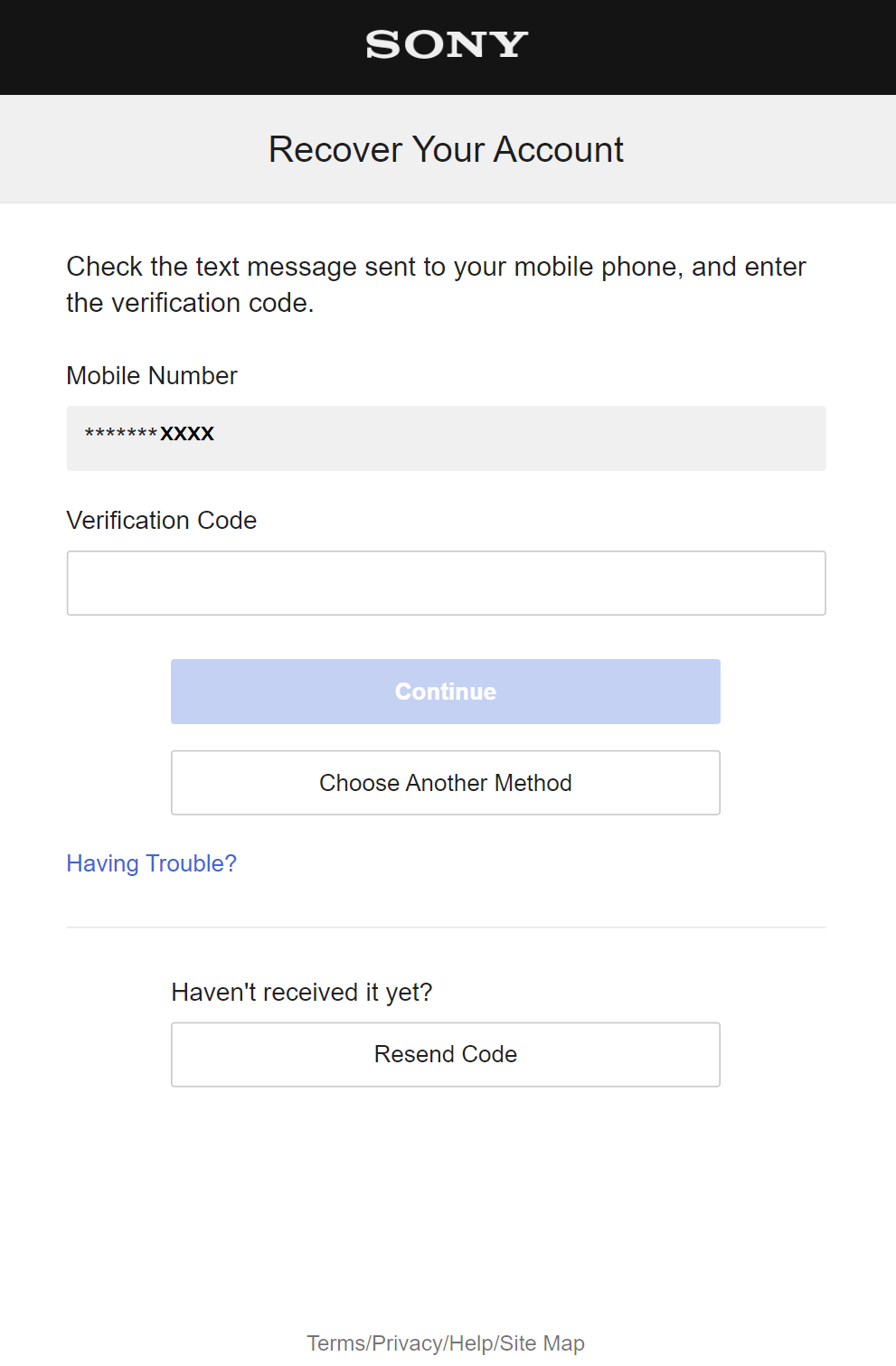 If you selected “Mobile Phone”, a text message will be sent to your mobile phone. Enter the verification code and select [Continue].