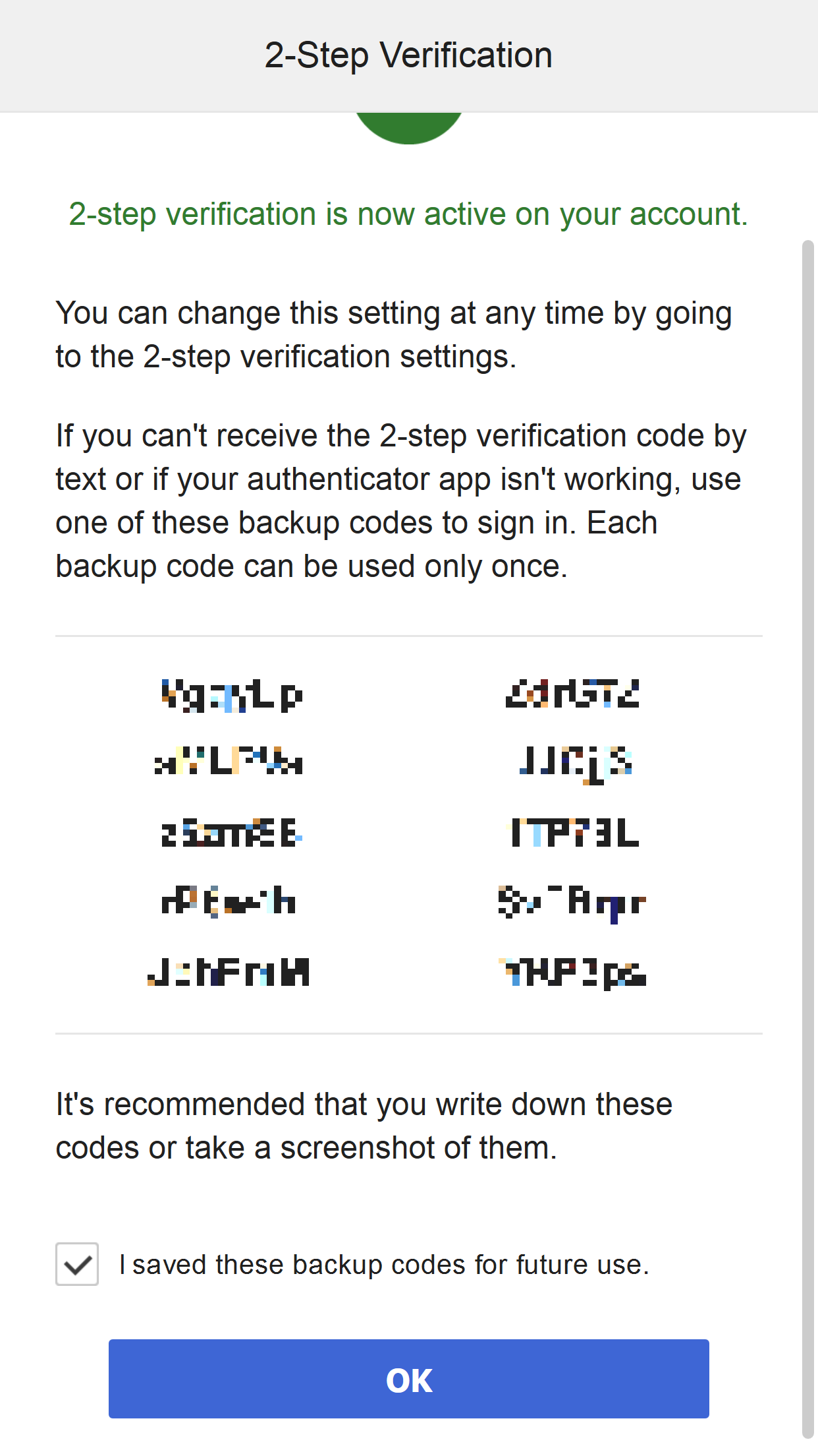 We recommend making a note of the backup code. Take a screenshot, for example.