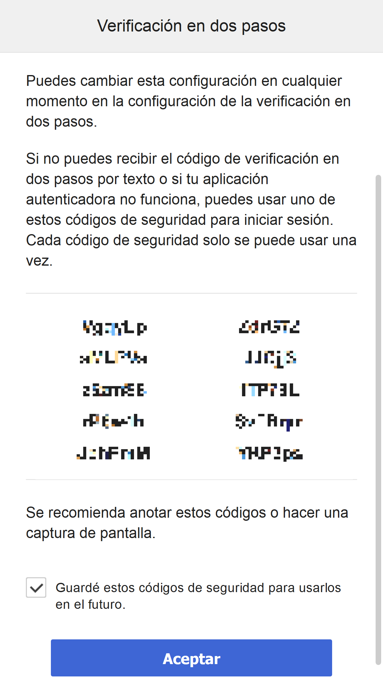 Recomendamos tomar nota del código de seguridad. Puedes hacer una captura de pantalla, por ejemplo.