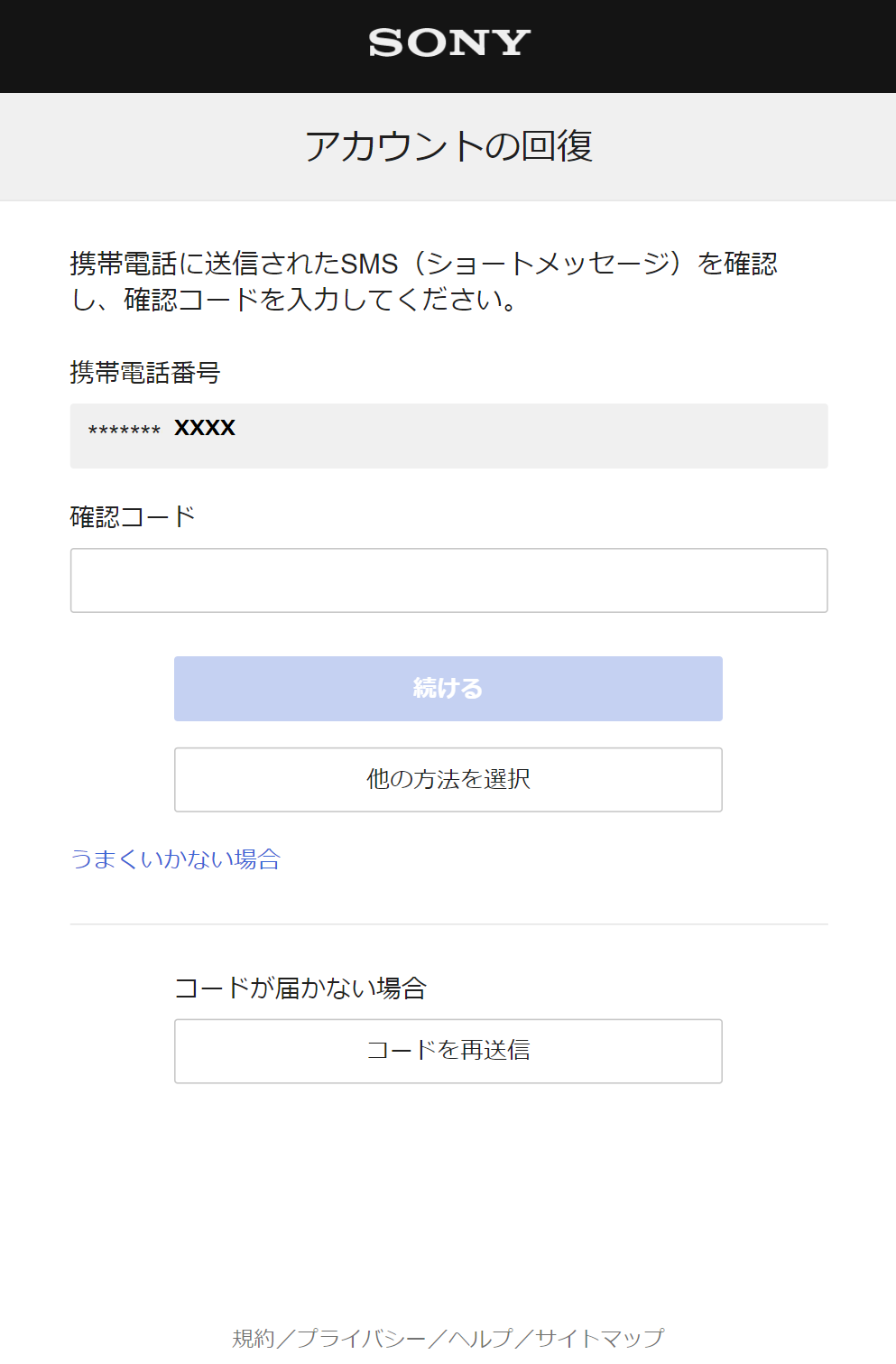 - 携帯電話 : 携帯電話のSMSに送られてくる確認コードを入力します。