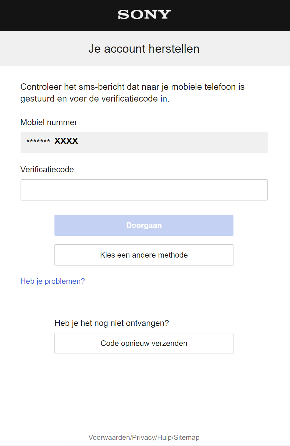 Als je Mobiele telefoon hebt geselecteerd, wordt er een sms naar je mobiele telefoon verzonden. Voer de verificatiecode in en selecteer [Doorgaan].