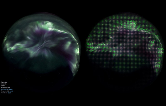 At first, without the proper equipment for photographing auroras, I tried using computer graphics to reproduce the faintly lit, wildly morphing phenomena. It was the dawn of the internet, so I provided breaking news on auroras from Scandinavia using a laptop computer and a digital camera, which was new to the world at that time. Eventually, by 2006, I developed a monitoring system with an ultra-high sensitivity video camera, installed it in an observatory in Alaska and started streaming auroras live. Since the real-time images from Alaska every day can be watched on a cellphone or projected on a dome, it has made me feel that the day the aurora explosion I am constantly searching for is not far away.