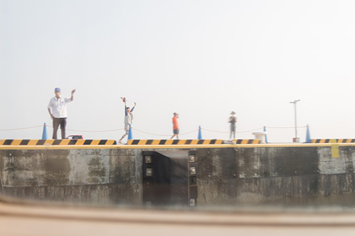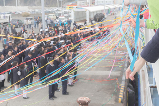 Captured from a ferry window, the pier and port are enveloped in a serene, warm-hearted glow. The sea glistens brightly from the sun reflecting off the surface. As the paper streamers unfurl, the students dockside bid farewell to the departing ship. Whichever photo you look at, the photographed image is flat, softened and brighter than what it actually seems to the naked eye in real life.