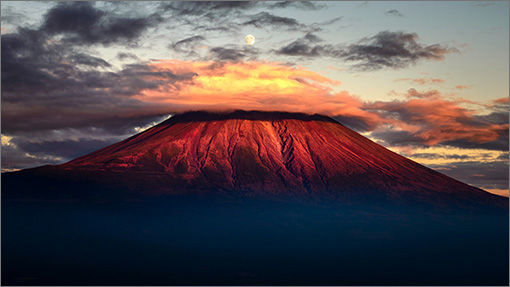 The full moon appearing above the peak tinged red by the setting sun
