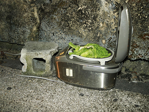 There is an old man, obviously into his cups, enjoyably plucking a jamisen (a stringed instrument used for playing Okinawan folk songs and the like; also called “sanshin” literally ‘three strings’) in front of a sign that can be translated as “NO ENTRY : CONSTRUCTION PERSONNEL ONLY”. In another work, an electric rice cooker sits randomly on the side of a road, lid open and a plate of Chinese cabbage wedged - for whatever reason - inside of it. Pointing to these works, Kinjo laughs, “Scenes like these are the true Okinawa. While living in Tokyo long ago, I’ve never seen bizarre sights like these from the southern islands where no one keeps their store neat and tidy. I like how Okinawa can be tacky and I mean that in a good way.”