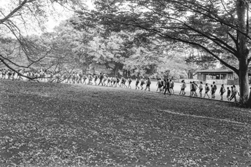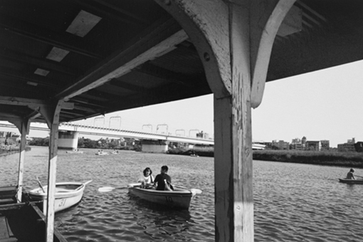 These photos capture everyday events familiar to all - cars driving past giraffes at a safari park, elementary school kids walking back to school from a fieldtrip in single file, a couple on a rental boat, a bridge about to sink in the swelled waters of a river, a moat covered in flower petals, high school students throwing rocks into a river, a desolate fishing pond, dried reeds along a riverbank and so on and so forth. Each one grabbed my attention for a moment and, as I took note, they became my memories.