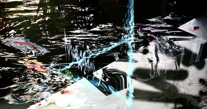 Lily Night depicts a unique view of the world using a crossover of analog and digital media including straight-up photography, industrial-grade organic solvents, digitalized and edited drawings and paintings, and collages reconstructed from cut and layered images. Her work alludes to a biologically threatened society that is pushing cyber-dependence to the point of blurring the lines between life and death. Both strong will and intuitive concern emanate from her use of space, composition and the heavily political motifs and sensational colors she chooses to overtly imply a power structure that is both visible and invisible.