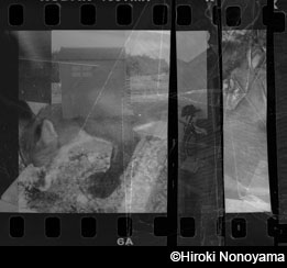 Hiroki Nonoyama tore apart negatives and reconstructed them as the works that will be displayed. The technique of reconstructing negatives is influenced by two recent works by Nobuyoshi Araki (1940-). The first is the 2011 publication, The Diary of the Old Photographer. He cut black-and-white film, printed the film and collected it to make a photo book. The second is a pictorial record of the 2014 photo exhibition Kirishin (Cut Photos) by Nobuyoshi Araki. This photo exhibition showed works in which the image of a color positive film was cut in half and combined with the other cut half of the film. Nonoyama also expresses the layer and materiality of the image by using a technique of manually stacking and joining films.