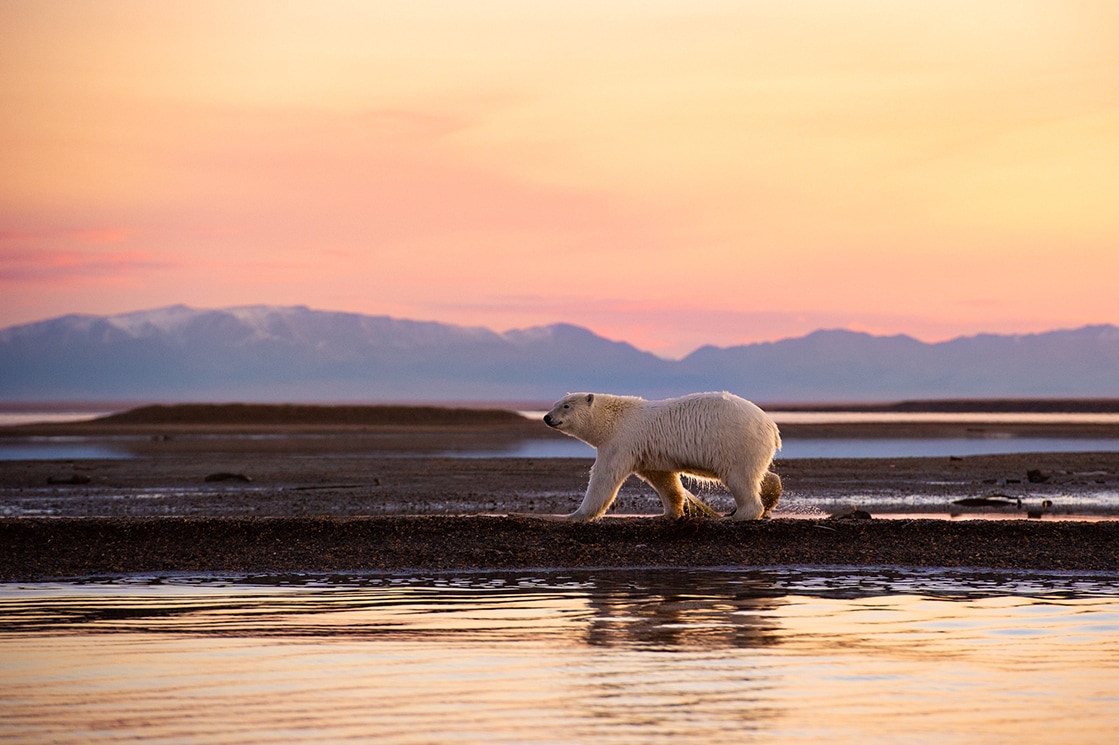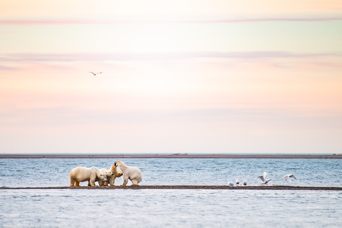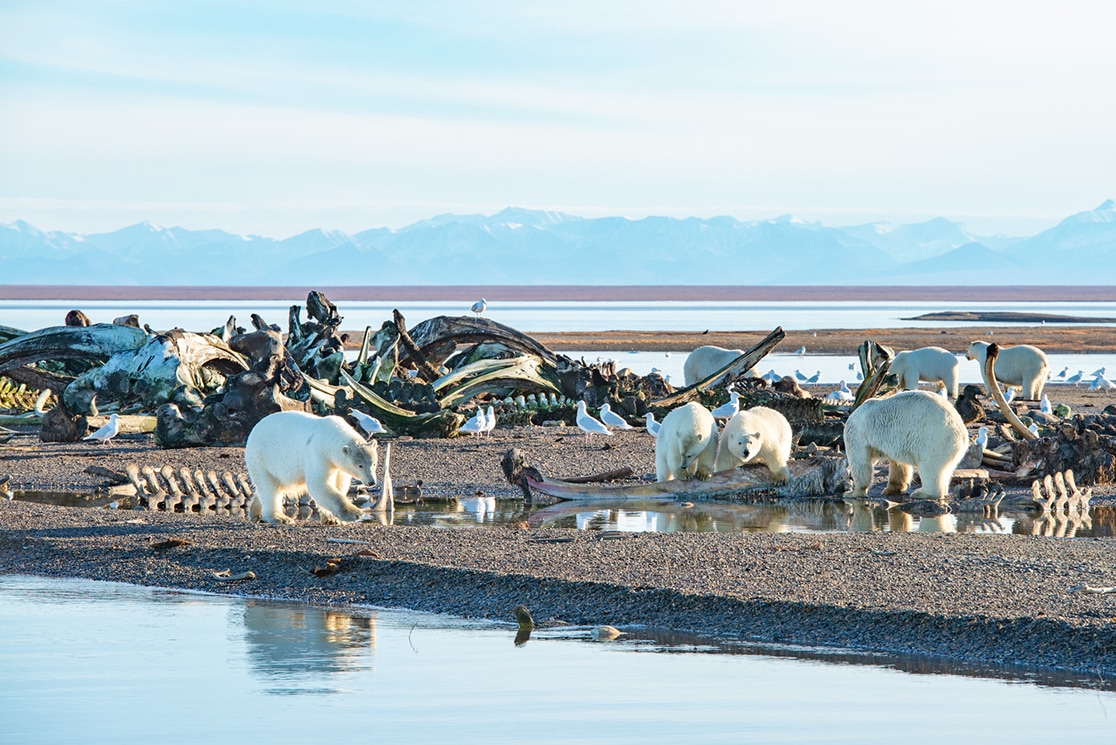 A group of polar bears flocked around the remains of a whale, enveloped by the pinked sky