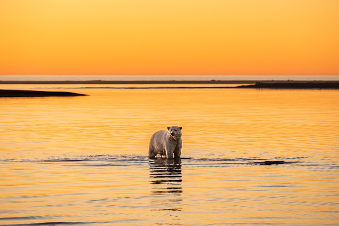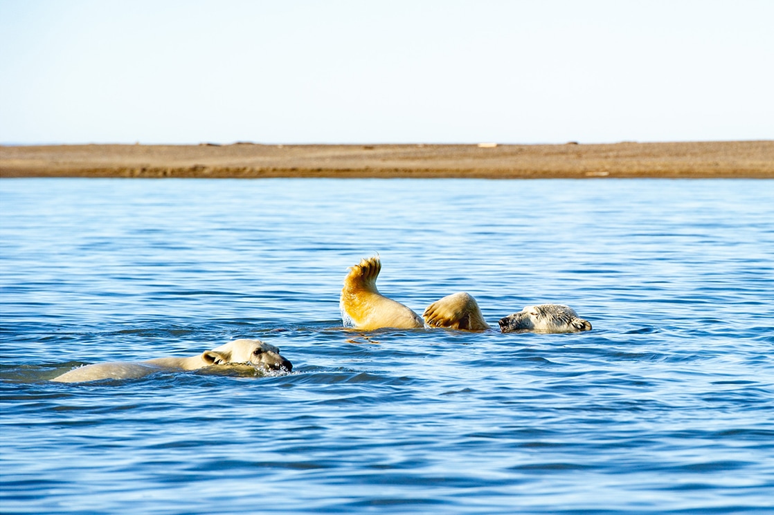 The only ripples in the water were the shimmering wakes of swimming polar bears.