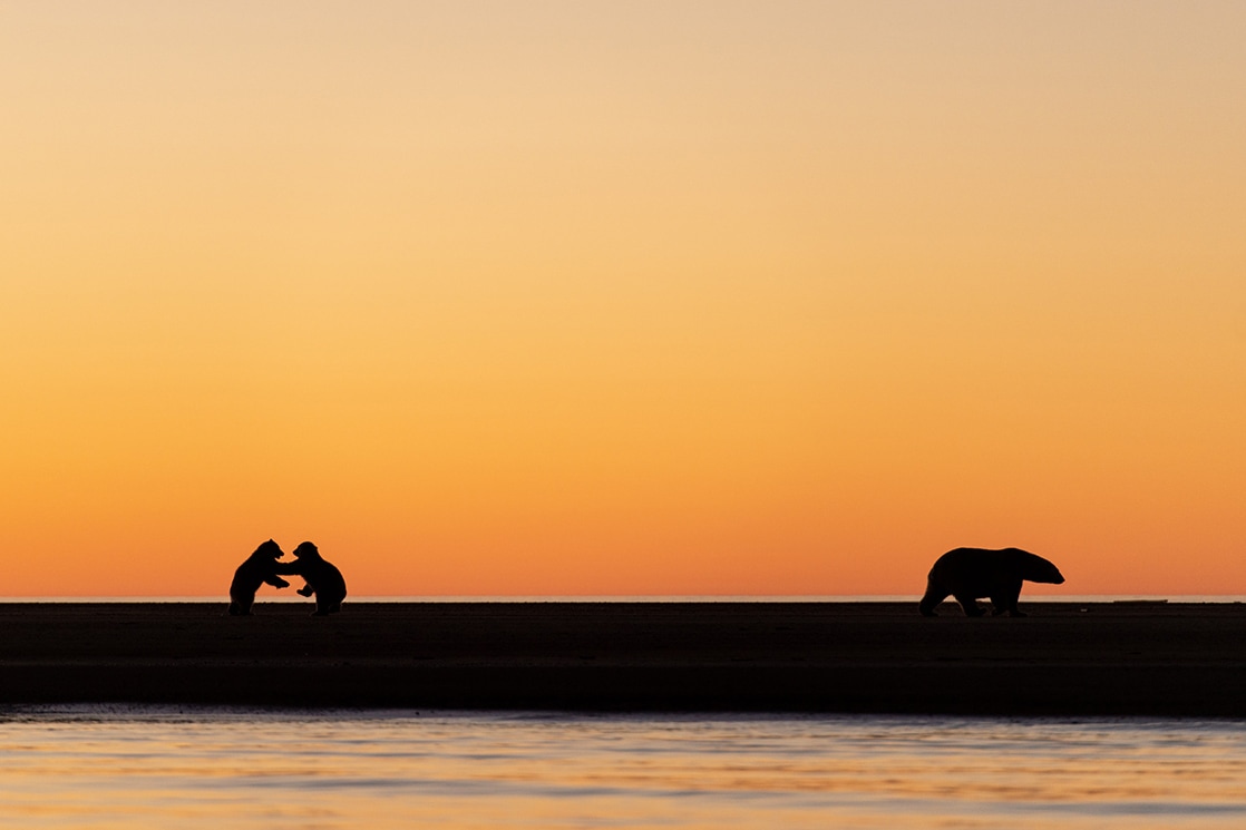 Turning around, I saw a mother and her cubs swimming in a dazzling sea of orange, while the other cubs played along the shore.