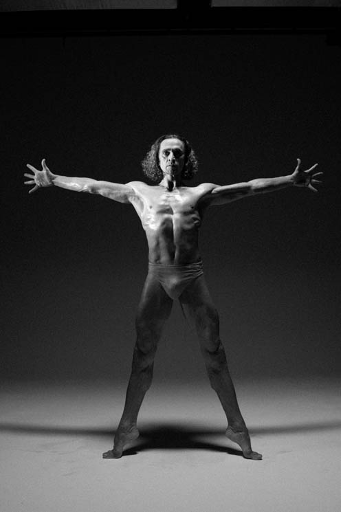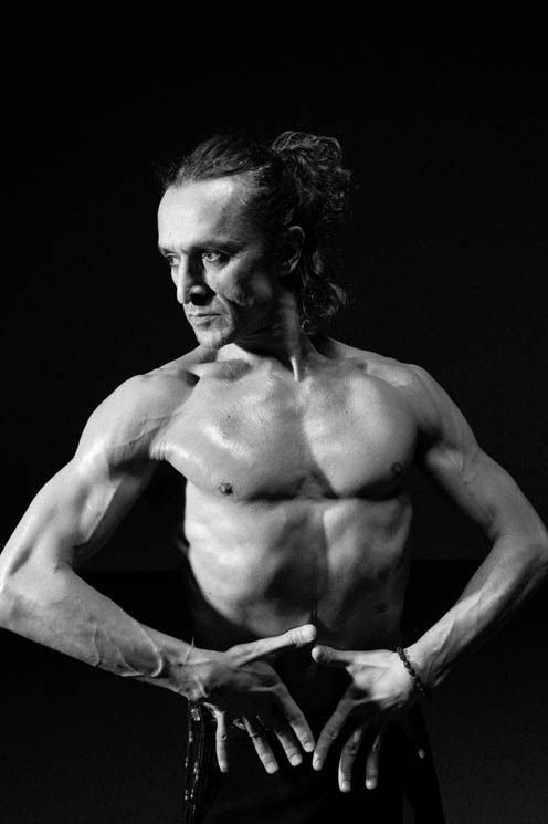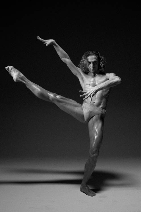 Because of his ballet training, Ruzimatov is physically as strong as steel yet snaps like a whip. He performs jumps that slice through space and commands a presence that dominates the stage. Muscles visible from head to toe, his lean body looks sculpted.I figured the only way to confront his physicality was with a simple, straightforward backdrop and lighting.