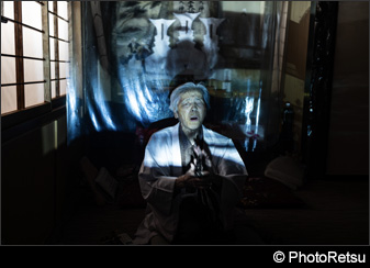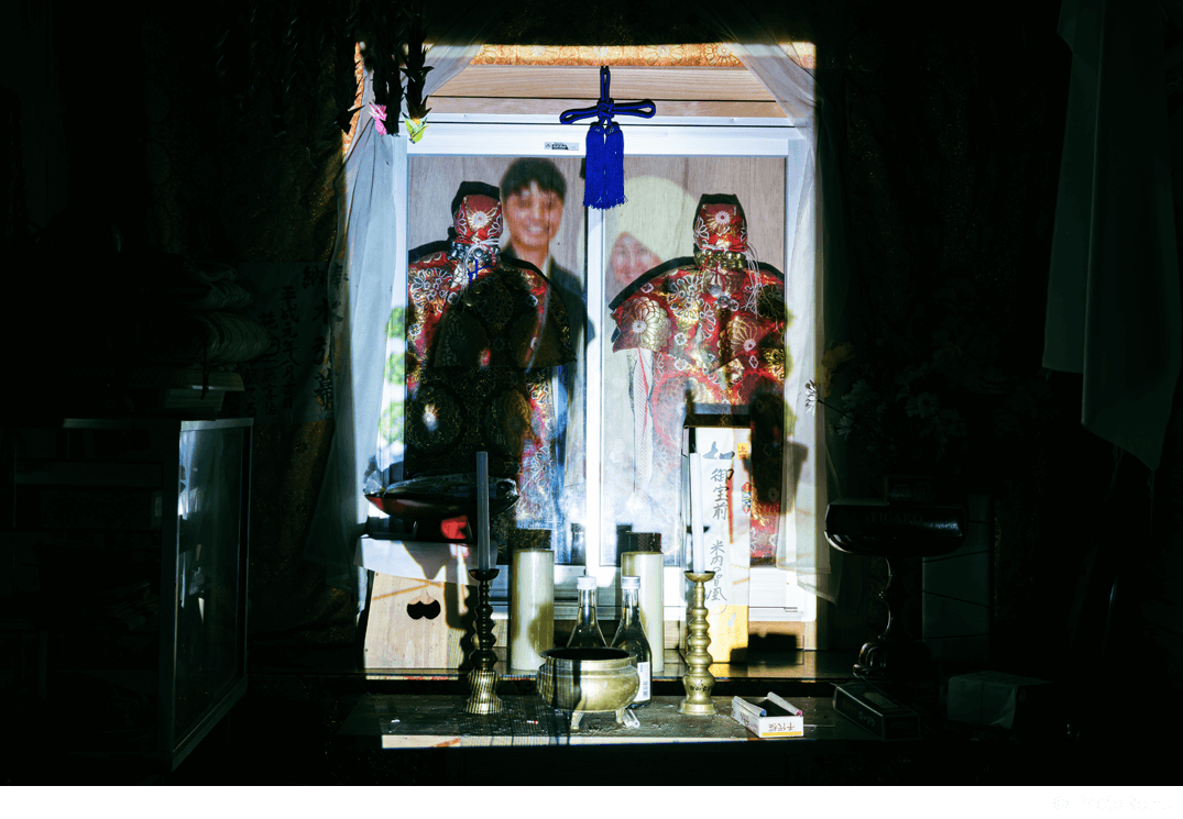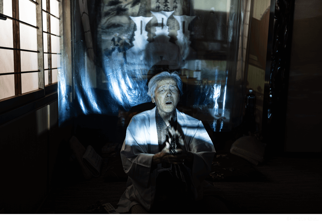 For the past two years, I have been taking pictures of the blind itako (spiritual medium), Take Nakamura.Itako work includes praying, fortune-telling and exorcism, but the majority of people visit her for channeling, the practice of bringing the soul of a deceased person into the spiritual medium. Channeling is when the soul of a deceased person possesses the itako and the itako mediates communication between the dead and the living.During the filming, I witnessed many times how the people who interacted with the deceased through channeling left with light hearts and smiles on their faces, saying that they felt relieved, nostalgic and warmed up inside.