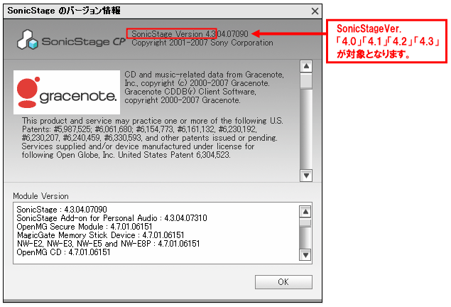 - SonicStage CPのバージョンが4.0/4.1/4.2/4.3以外の場合は対象外となりますので、 セキュリティ脆弱性対策のためのバージョンアップは不要です。