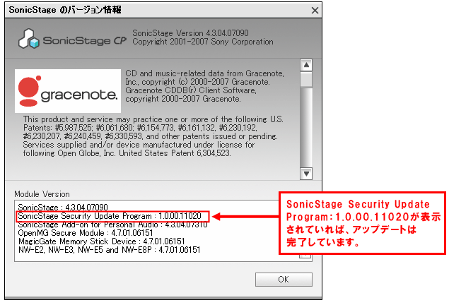 SonicStage Security Update Program 1.0.00.11020が表示されていれば、正常にアップデートは完了しています。