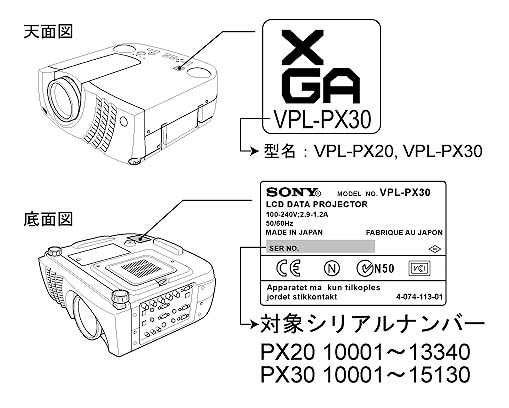 さて、弊社が平成11年11月より発売しております「業務用LCDデータプロジェクターVPL-PX20/VPL-PX30」につきまして、天吊使用の際の設置工事時に強い力でネジ締めをした場合、部品強度上の問題により、インサートナット部が損傷し、その損傷の度合いによっては設置した本機が落下する可能性があることが判明いたしました。