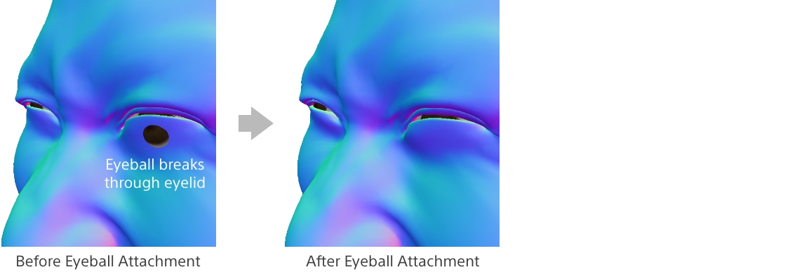 Facial Deformationの最後の工程では、破綻を抑制する処理を加えます。例えば、瞼の形は眼球に沿ってカーブを描きますが、これまでの変形処理を適用すると眼球と瞼の間に隙間が生じる場合や、反対に眼球と干渉してしまい眼球が皮膚を突き抜けるといった破綻が発生する場合がありました。また、口腔の形状はカメラで観測することができないため、そのままでは表情変化に応じた正しい形状を再現することが難しいといった課題がありました。