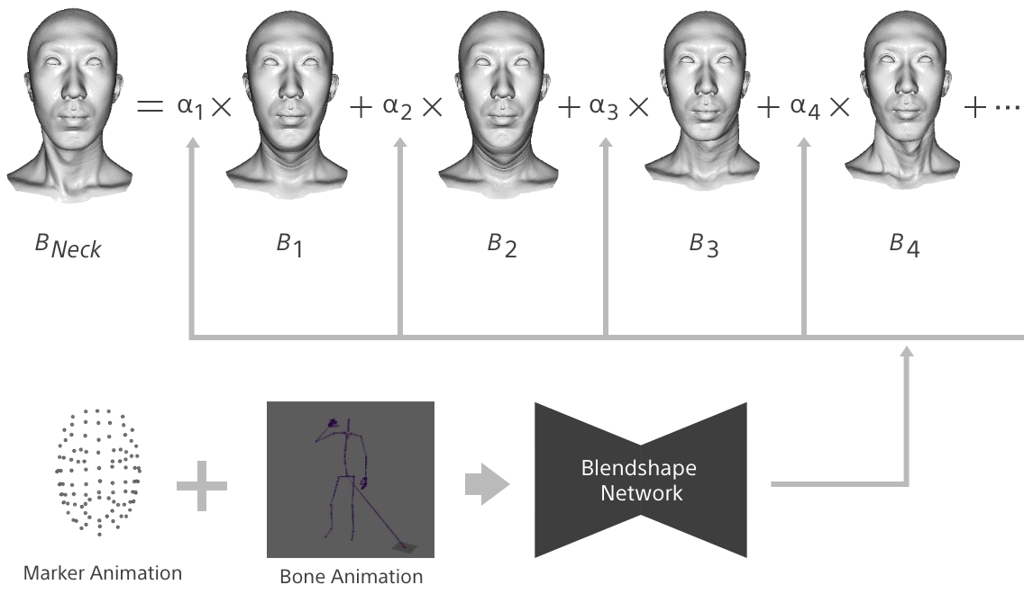 これらのデータから首の形状を推定するのが「Neck Deformation」技術です。事前に複数パターンの口の形状とあらゆる顔の向きを組み合わせた学習データを作成し、この学習データから首の基底となる形状を抽出しています。首の形状はこれら基底の組み合わせで再現されますが、どのように組み合わせるかは撮影データの下顎の動きと首の向きから推測しています。これにより、自然な顔と体の動きを繋ぎ合わせる首の形状を再現しています。現在は大量の学習データから首の形状を再現していますが、今後は少ない学習データでも再現できるよう、開発を継続しています。