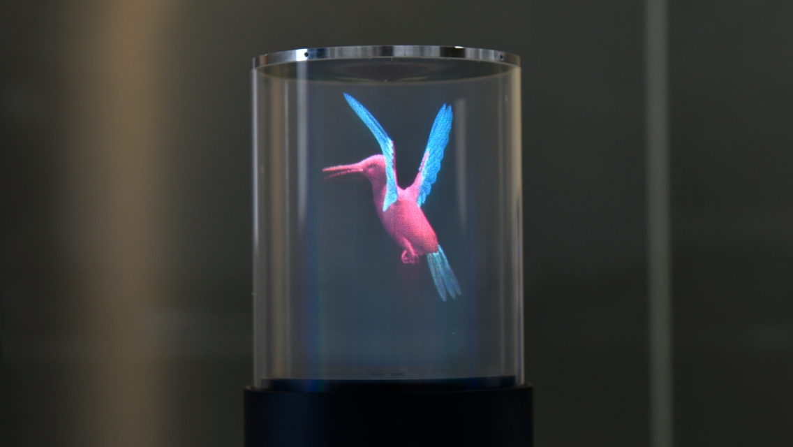 この研究の最初のステップとして開発したのが、透明性と輝度の両立するスクリーンにより、2Dでありながら浮遊感のある映像表現を実現する、円筒型透明スクリーンディスプレイです。