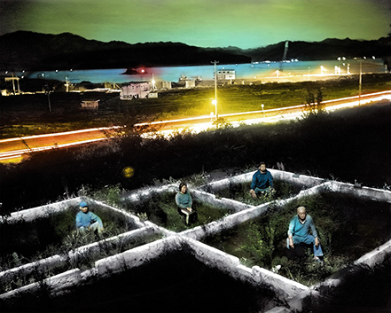 チャスキエルベルグ氏は大槌町に3回訪れ、トータルで約1カ月半の滞在中に精力的に作品を制作しました。ある作品では、被写体となってくれる人たちに、もともと自分の家があった場所に夜来てもらうようにお願いし長時間露光中の数分間、静かにその場に座ってもらい撮影を行いました。